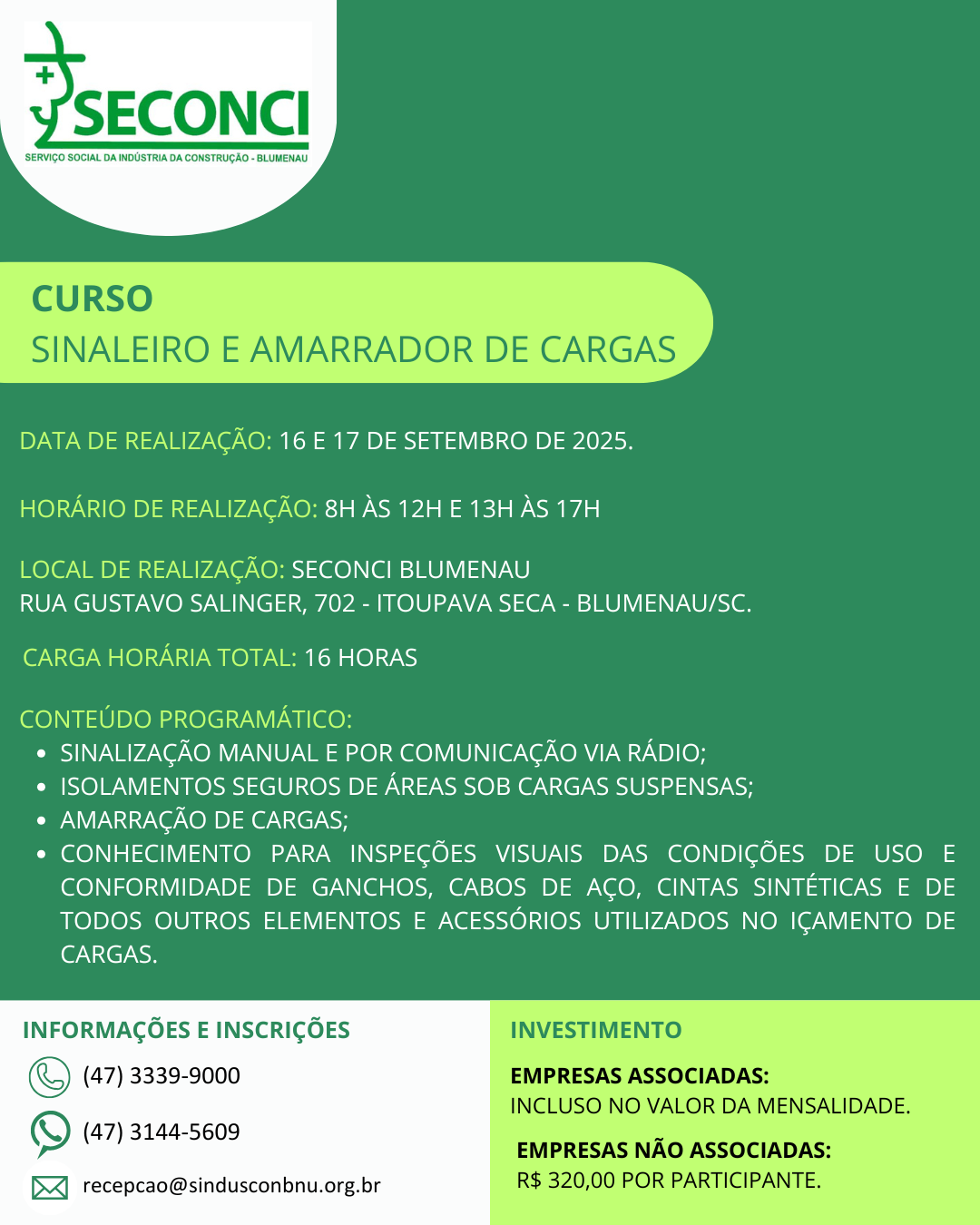 *NR 18- CURSO SINALEIRO – AMARRADOR DE CARGAS * Presencial – 8h às 12h – 13H às 17h Teoria: 16/09, 8h às 12h – 13H às 17h Teoria: 17/09, 8h às 12h Prática: 17/09, 13h às 17h. (na obra) ** Inscrições devem ser confirmadas até dia 12/09/2025** INFORMAÇÕES: 1. Inscrições: pelo e-mail recepcao@sindusconbnu.org.br ou WhatsApp 47-3144-5609. Cancelamentos: deverão ser realizados até um dia antes do curso por e-mail ou WhatsApp. 2. Pontualidade: A tolerância de*atraso* é *15 min*. *Falta ou atraso, será cobrado multa da empresa*. 3. Legislação: Treinamentos deverão ser realizados em horário de trabalho. 4. Vestimenta: *O uso de sapato, calça e camiseta são obrigatórios*. 5. Alimentação: SECONCI não fornece refeições. Há opções nas proximidades. *Observação: Muitos trabalhadores tem agendado compromissos no dia do curso e pedindo para sair mais cedo ou durante. Consideramos falta e o mesmo deverá retorna na semana seguinte para fazer todo o curso*. Visite nosso site e acompanhe a agenda de cursos: www.seconcibnu.org.br